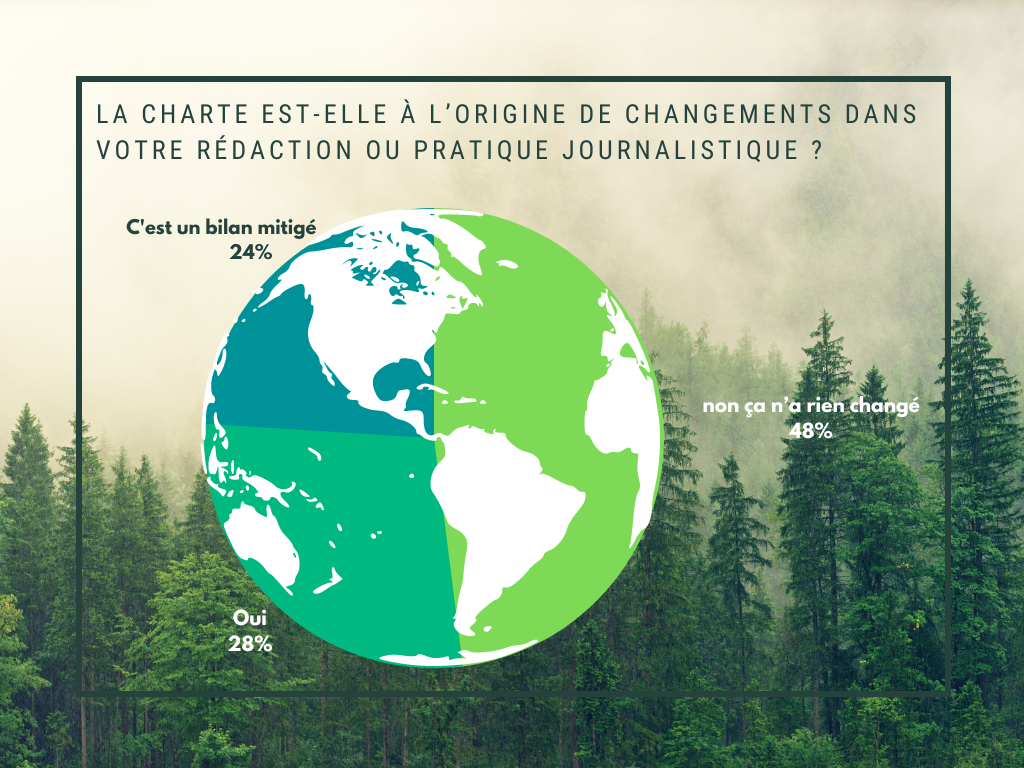Un sondage a été réalisé auprès des signataires de la charte. 28% jugent qu’elle a permis des changements, 24% constatent un bilan mitigé et 48% ne voient pas de changements. Les signataires rapportent que depuis l’établissement de la Charte, ils interrogent de manière plus systématique l’impact environnemental du sujet qu’ils vont traiter. Il y a eu des créations de groupes climat environnement dans des rédactions et la formation continue sur la transition écologique a été renforcée. Si la publication n’a pas été suivie de faits dans certaines rédactions cela s’explique par “un manque de temps pour les publications quotidiennes et une hiérarchie des sujets pas suffisamment conscientisée” précise la co-autrice.